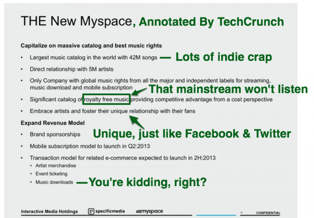 This all makes the projections in Myspace’s pitch deck nearly laughable. It thinks it will lose just $25 million next year, be making $10 million by 2014, and printing $33 million on $140 million in revenue by 2015. I’m not counting Myspace out. There’s potential for it in spaces like meeting new people or customized content feeds, but streaming music? That’s pretty hazy.
