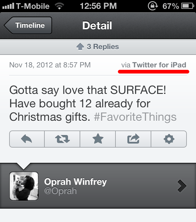 Even if Oprah has never used a Surface or insists on using official Twitter apps, she can still use the Twitter website — especially if she only needs to send one endorsement tweet for the Surface. And yes, the tweet would look the same even from her iPad. Now it makes her look like a sell-out.