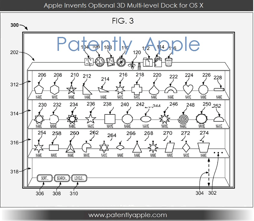The patent describes a multi-level dock that resembles the 3D bookshelf-type interface it uses for iBooks and Newsstand in its graphic renditions. The feature would be optionally configurable, and would feature quite a few more apps than it’s possible to include in the dock. The dock could be configured using a settings tool available when it’s fully extended, and there are sort tools described in the patent for arranging the elements it contains according to different criteria, or for searching for the app you’re looking for.