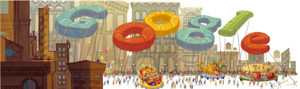 Along with the Thanksgiving-themed Google doodle gracing the Google.com homepage in the U.S. today (this year, it’s a Thanksgiving Day parade with Google’s letters as balloons), Google is also using the valuable advertising space below the search box to push Google+ and other Google properties. The homepage text reads “Hang out with the whole family this Thanksgiving,” but after clicking through, you’ll discover more than just tips on using Hangouts’ video chat.
