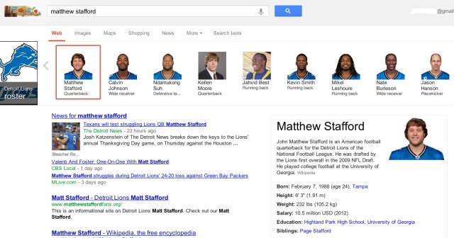 That being said, there are some good examples in this guide to impress those with less familiarity with Google’s offerings. One especially fun demo is of Google’s semantic search integrations collectively known as Knowledge Graph. Here, it’s put to use showing off sports stats. A search for Detroit Lions’ Matthew Stafford includes the entire team’s roster pinned to the top of Google’s search results page, in a scrollable, clickable lineup. Handy.