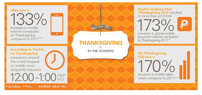 eBay saw a 133 percent increase in mobile volume transacted on Thanksgiving, compared to 2011. PayPal says that Thanksgiving 2012 resulted in a more than 2.5-fold (173 percent) increase in global mobile payment volume compared to Thanksgiving 2011.