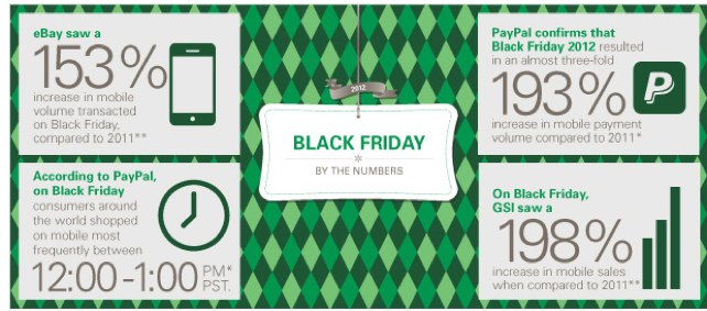 For Thanksgiving, eBay saw a 133 percent increase in mobile volume transacted; and PayPal saw a 173 percent increase. While more shoppers are hitting their phones and tablets for sales on Thanksgiving, it’s also apparent that consumers are perhaps forgoing the malls and stores for mobile shopping on Black Friday, as well.