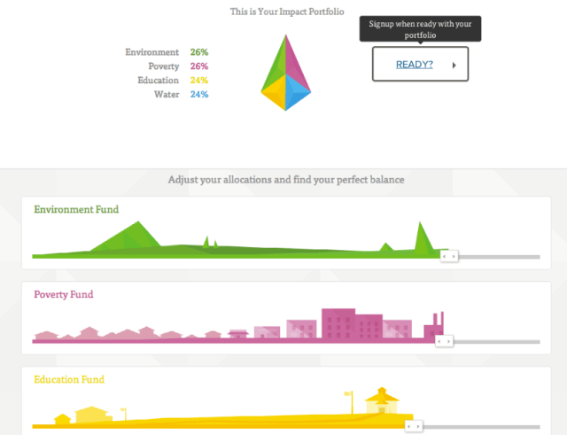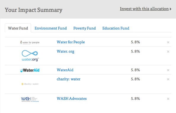 The idea, Walrod tells us, is to give a more personalized feel to charitable donations, allowing users to curate their investments in a portfolio allocating 60 percent of their donations to water and 40 percent to education, for example, just as they would when investing in the public markets.