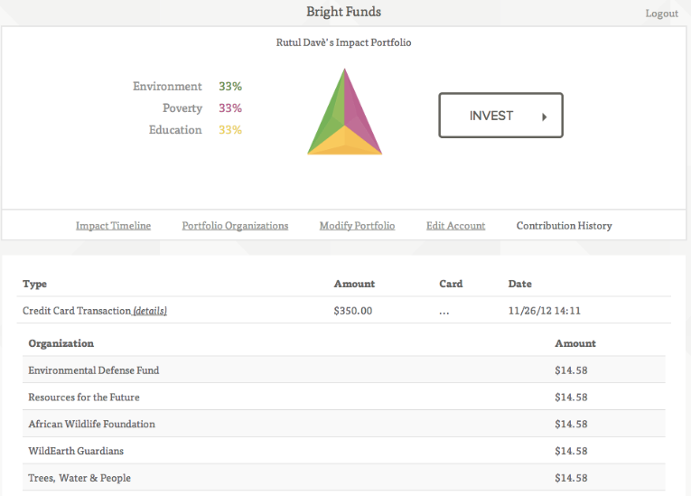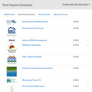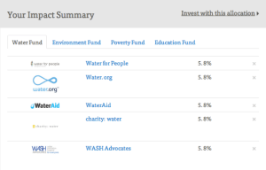 The platform creates a set of “mutual funds” comprised of between 10 and 15 non-profit organizations and allows users to invest in these funds, while building personalized investment portfolios centered around particular causes. At launch, the startup’s mutual funds focus on four areas: Poverty relief, water, education and the environment. The education fund, for example, includes non-profits like Teach For America, the KIPP Foundation, Jumpstart and iMentor and groups its chosen organizations into groups, like “Resources and Infrastructure” or “Accessible Education.”