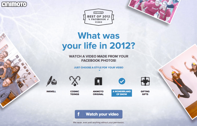 I’m a big fan of Animoto and its automatic video-creation service. But even if you get a service to automatically create videos from photos that you’ve chosen and uploaded, there’s still, um, the process of choosing and uploading those photos. What if you didn’t even have to do that? That’s what Animoto is showing off today, with the launch of an ultra-easy site for creating Best of 2012 video montages from photos they’ve uploaded to Facebook.