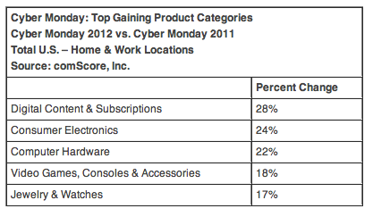 ComScore does not break out which categories saw the biggest spend of all, but it does point out who grew the most. Interestingly it was something nonphysical — digital content and subscriptions, which grew by 28% over last year.