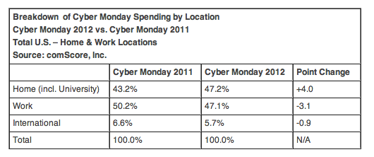 What’s interesting is that while Black Friday sales are buoyed in part by people having the day off work in the U.S., Cyber Monday is big precisely because it’s online, and so it becomes easier for people to shop while in the office. comScore notes that this is the first year, however, that spend from home and university computers outweighed spend from work computers at 47.2% compared to 47.1%. It also says that international users — perhaps more concerned about the economy and the price of long-distance shipping — spent about 1 percentage point less, accounting for 5.7% of sales.