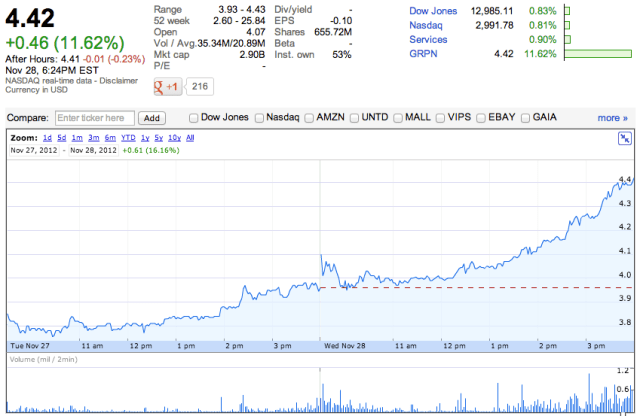 Groupon shares (NASDAQ:GRPN) closed at 4.42, 11.62 percent above yesterday’s level. CEO Andrew Mason’s interview was highly anticipated today. Yesterday, AllThingsD reported that the board questioned Mason’s vision.