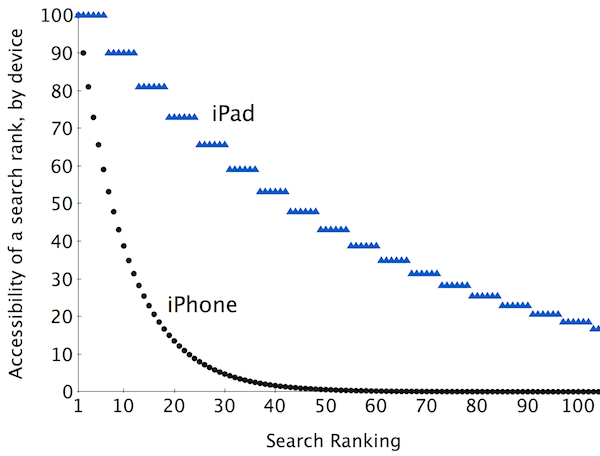 The score is a grand total of the estimated volume of each of the app’s keywords, each of which is multiplied by an “accessibility factor” corresponding to that app’s search rank under that keyword. This accessibility factor is a discount applied based on each keyword’s search rank, and is different depending on the screen size of the device. For iPhone (iOS 6), with only one search result per page, SearchMan assumes that each ranking position is only 90% as accessible as the position above it. For iPad (iOS 6), with six accessible apps on each results page, it assumes that each page is only 90% as accessible as the search result page before it.