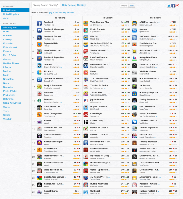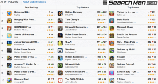 The new score has now been implemented for every app inside the App Store, following a month of testing and customer feedback. It appears in a new section of SearchMan’s website called “Market Data,” which also includes a top 25 leader board, as well as ranks of gainers and losers for iPhone and iPad apps in the U.S., U.K. and Japanese App Stores. Hiro says SearchMan will add support for China in Q1 2013, too, and also plans to expand the Market Data section with more information in the future.