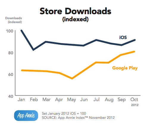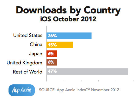 The report also reveals some interesting changes in the trends regarding which countries account for the greatest percentage of app sales and downloads. These numbers paint a changing picture of who has the most influence over mobile software in terms of audience size: China is growing fast, accounting for 15 percent of global app downloads on iOS, while U.S. share has dropped from 30 to 26 percent of downloads during the course of 2012. In Google Play, the U.S. accounts for 21 percent of downloads, with South Korea, India and Japan occupying the next top three spots.