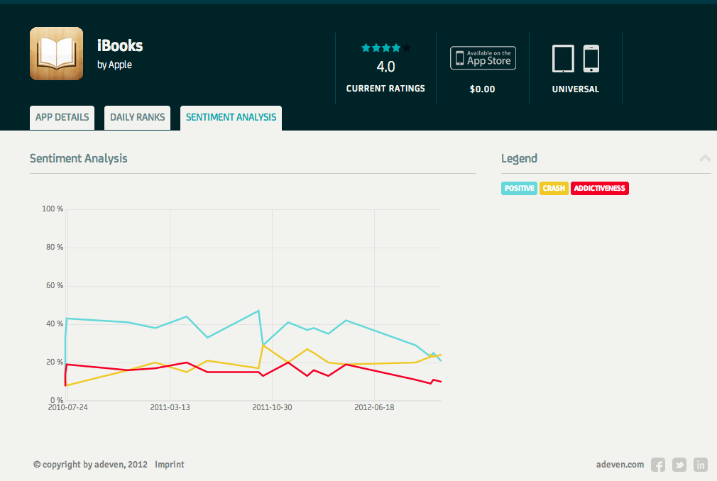 Adeven now places a small sentiment analysis graph on any app in the App Store for which it has review data, and you can click through to see a more detailed view. That gives you a line graph detailing the app’s progress in each of the sentiment categories since the app’s introduction. It’s a good way to see trends emerging at a glance, and even with only three measures, you can see interesting correlations in the data. For instance, checking out iBooks, it’s clear that a growing number of crashes reportedly caused by PDF imports is affecting reviewer satisfaction – positive reviews have just dipped below crash reports in terms of the percentage make-up of reviews for the current version.