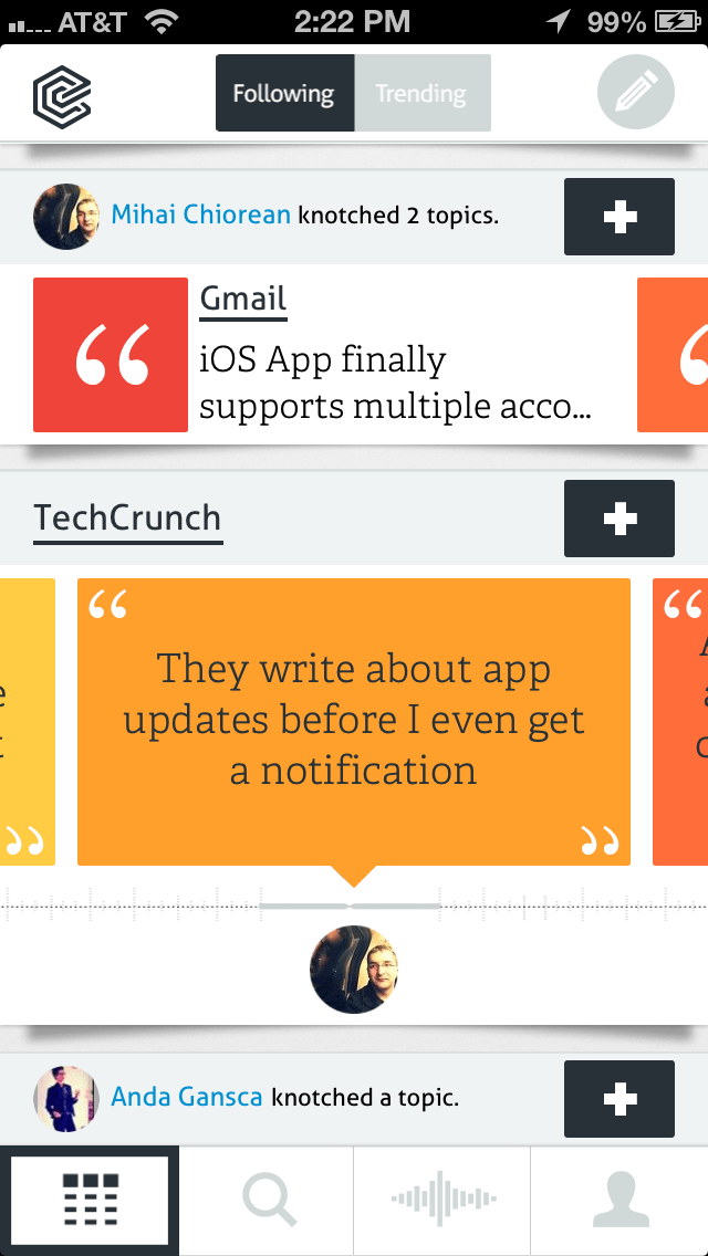 With a Twitter-like following model in play on the social side, Knotch allows you to see what your friends are sharing, as well as the topics trending across the network itself. You can also search for other topics within a separate section in the app and see which have recently hit your Knotch timeline.