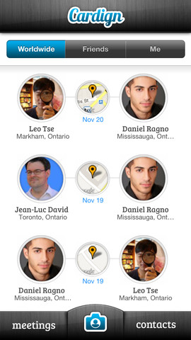 The app isn’t just about image recognition even in its current, early form. It also hosts its own contacts list, which operates separately from your iPhone’s built-in address book, since David said that in beta testing users found keeping them separate was preferable, owing to the fact that they didn’t necessarily want all of their Cardign contacts in their primary address book. The benefit of the in-app address book is that it’s dynamically updated, so that if someone changes jobs or phone numbers on their social media profiles, that information is automatically available to Cardign and its users. Another feature tracks all meetings made through the app, so that people can see when and where others are connecting via the service. For now, David said they’re keeping all of those parts of the service out in the open, but he hinted that privacy controls might be in the works for future releases.