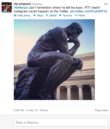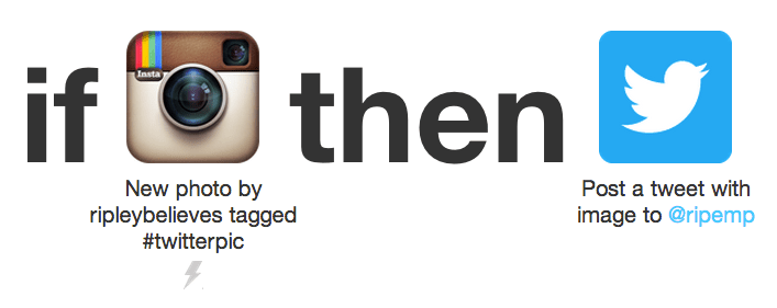 Huh? Basically, IFTTT is a command interface that enables you to set triggers for specific actions like, “if I post a photo, automatically save it to Dropbox,” or in this case, “if I post a photo on Instagram tagged with “#twitterpic,” then post it to Twitter (with a card). This conditional statement/equation is called a recipe, and IFTTT has a ton of awesome ones for a whole mess of things.