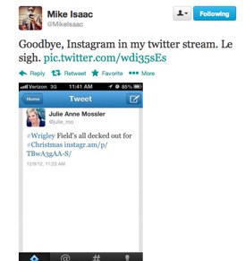 We’re seeing chatter on Twitter that Instagram photos are not showing up in Twitter streams anymore. This is obviously interesting considering Instagram’s recent moves to remove support for Twitter cards last week. We’ve reached out to both Facebook and Twitter for confirmation. (See UPDATES below.)