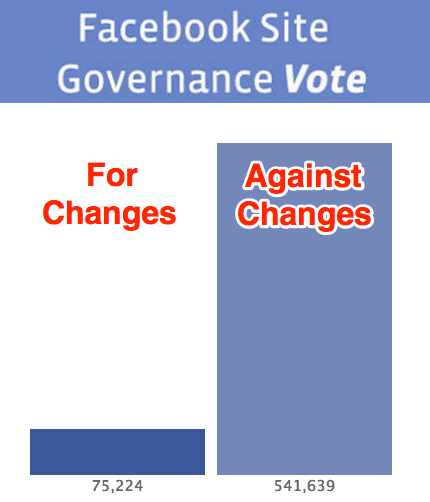 Some think Facebook was never a democracy even with the voting structure since the system made it almost impossible for the results to be binding. This is the third, and likely final Facebook site governance vote, and it may end up drawing the highest turn out ever. It follows one in April 2009 when 665,000 people voted, and another last June where about 342,000 cast their ballots. Facebook got far more than the 7,000 necessary comments on this proposal to trigger the vote. As of now, 544,642 have voted against changes and 75,539 have voted for them.