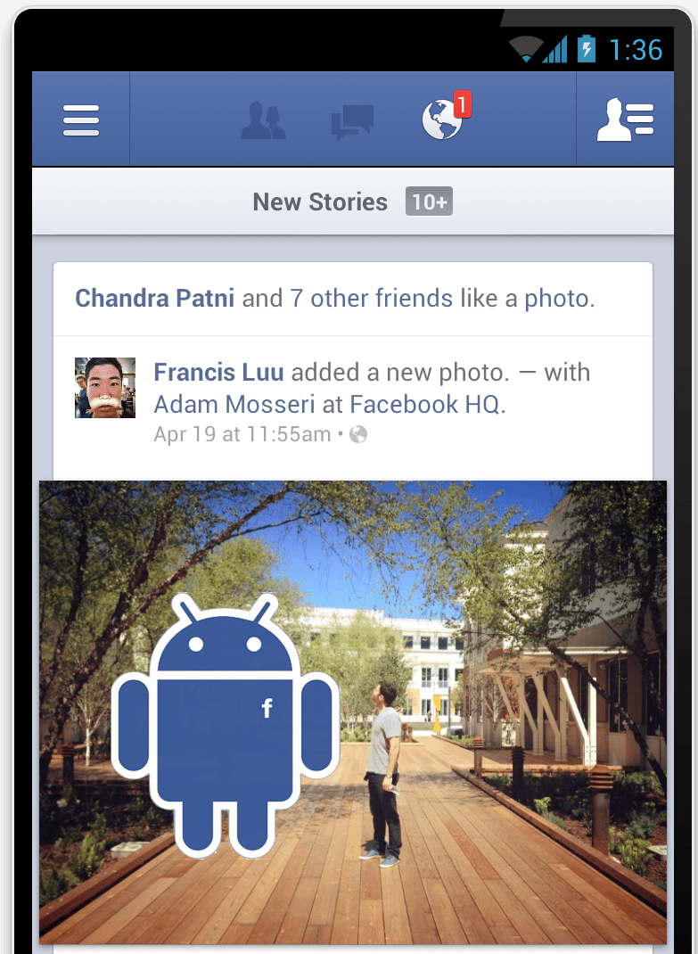 That brings us to today. Facebook for Android 2.0 will be rolling out to the Google Play store over the next few hours. By retooling the app natively, the app launches more quickly; notifications and Timeline load faster; and news feed stories show up sooner and scroll smoother thanks to Facebook’s new custom ListView recycler. You’ll get alerted to newly published stories from friends thanks to a drop-down banner. Photos now open almost instantly because they’re loaded into a device’s native memory rather than the Java heap.