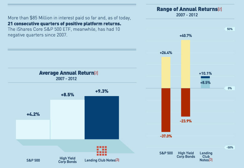 There are also some macro trends at play that are helping the startup’s cause. In a down economy, investors are looking for more stability, while maintaining solid returns. Peer-to-peer lending has the potential to offer investors more transparency, less duration and credit risk than traditional options, like high-yield bonds. In Lending Club’s case, the startup has grown its pool of investors to 45,000, who see an average return of between 5.7 and 13 percent. Compared to traditional investments in high-yield bonds or the S&P, p2p offers the potential for much steadier and more regular returns — what every investor wants to see.