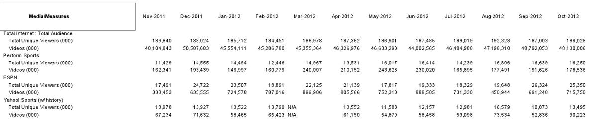 Above, you can see a comparison of Yahoo Sports, ESPN and Perform beginning in November 2011, running through October 2012. ESPN led the rankings over that time, with Perform seeing some modest gains on the leader. But from October to December, Perform saw a huge boost (of nearly eight million unique viewers), which seems almost unbelievable, but the company tells us can be attributed to a new distribution deal it signed with the NFL in October.