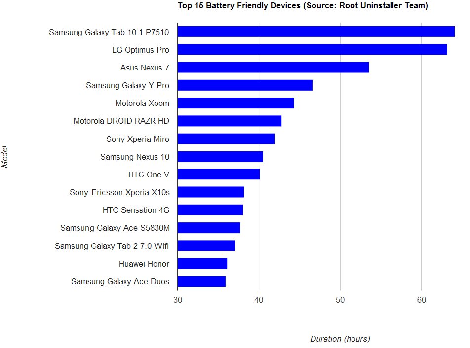 As you can see in the list, Root Uninstaller looks at both Android tablets and Android smartphones, which you might expect to skew the results a little bit. But despite a dominating performance from the Samsung Galaxy Tab 10.1, the list of the top 15 performers was a healthy mix of phones and slates. Coming in a close second with over 60 hours of battery life on average was the LG Optimus Pro, a phone released in July with a hardware keyboard and relatively small 240×320 display running Android 2.3.3 with a 3 MP camera. It’s on odd duck, with its QWERTY and VGA video, but it’s cheap, and according to this list, if it’s battery life you’re after most of all, you can do no better than the Optimus Pro.