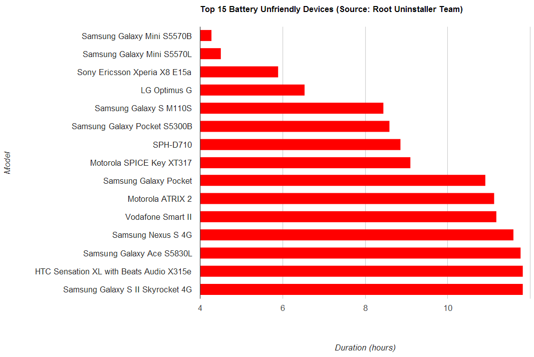 Overall, Root Uninstaller’s list covers 474 Android devices and spans 5,585 user-submitted battery reports, so it has a decent-sized sampling, plus you see a lot of synchronicity with what reviewers and users have shared anecdotally about device battery life. The average life overall for Android devices is 20.4 hours, by the way, or just under a full day, and the top battery killer apps are generally actually boring system processes, as well as something called “Cowboy.” Battery life isn’t bad overall based on these numbers, but it’s not great either: next generation battery tech, whatever that ends up being, can’t arrive soon enough.