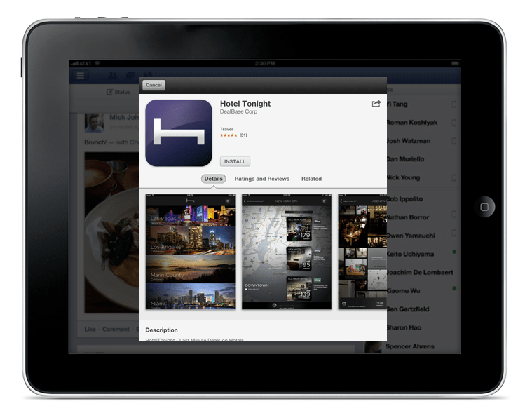 Now Facebook is using the mini App Store dialog to boost the value of its recently launched mobile app install ads. These let developers pay to show an image, description, and install button for one of their apps within the Facebook news feed. It’s part of Facebook’s play to dominate the app economy by controlling discovery outside of the App Store and Google Play.
