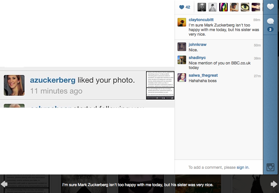 Today, Arielle Zuckerberg publicly “liked” an Instagram photo from New York-based fashion photographer Clayton Cubitt that’s essentially a screenshot of the most controversial bit of the new Instagram ToS with the caption, “Instagram’s suicide note.”