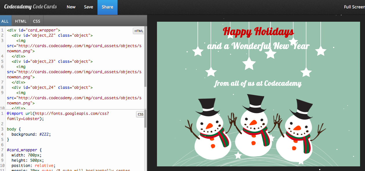But all’s not lost. The enterprising folks at Codecademy have been at work these past few days and this morning launched a pretty nifty new product called ‘Cards’ that lets you build, remix, and send your own custom holiday greetings in HTML and CSS.