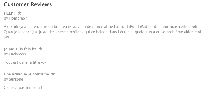 As a parent and lover of Minecraft, this is an absolute outrage. The Installous developer, Thoa Le, is also selling fake Springboard editors (really an alarm clock), fake lock screen apps, and an app that makes colorful backgrounds (but doesn’t really). As one French customer wrote “Ce n’est pas minecraft!” To that I would add “C’est de la merde!”