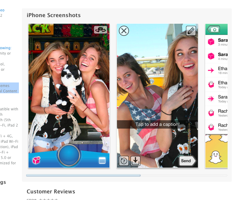 And the app’s marketing materials and app user warning didn’t help. The original screenshots on display in the App Store were of pretty girls in bikinis. The app warned of “Mature/Suggestive Themes” and “Infrequent/Mild Sexual Content or Nudity.”