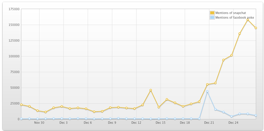 Here is the graph of Snapchat mentions and web searches compared to those of Facebook Poke over the past month: