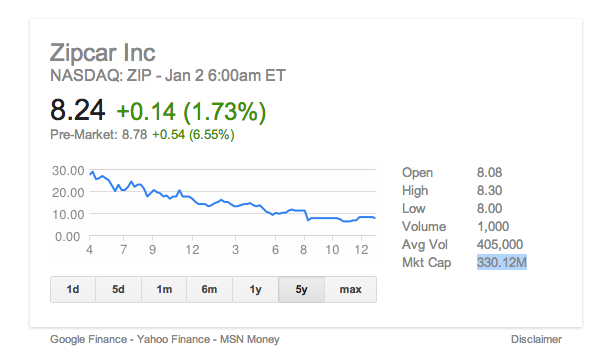 ZipCar began the morning of its IPO trading at $18 a share, and its stock eventually popped to $27.96 that day, a rise of over 50 percent. By the end of trading it was a billion-dollar company, at more than 2x the value of what it was acquired for today.