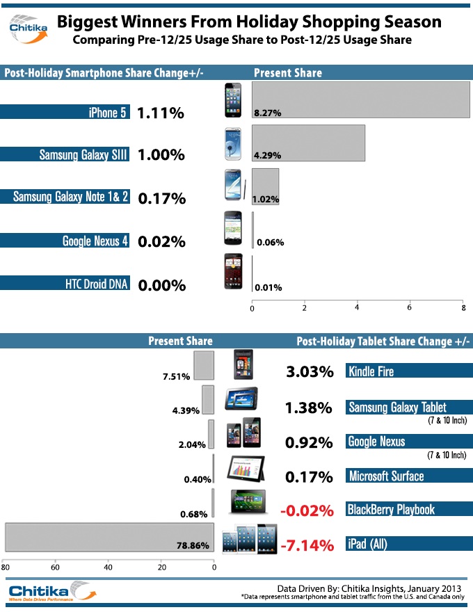 Mobile ad network Chitika measured traffic from tablets and smartphones via impressions on both the period leading up to Christmas and the period immediately following, and found a few devices grew their share significantly, while others didn’t fare so well. The iPhone 5 was the top gainer in smartphones, growing 1.11 percent overall following Christmas day; the Samsung Galaxy S III also grew 1 percent. But there was greater variance among tablets, where the Kindle Fire grew considerably, and iPad share actually dropped off.