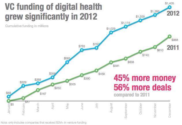 Rock Health’s year-end report paints a different picture; if not drastically different, at the very least a contrast. According to its research, in 2012, digital health startups saw 45 percent more investment and 56 percent more deals compared to the year prior, with total capital invested growing from $968 million to $1.4 billion.