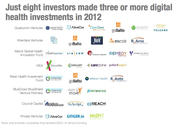 As for investors, 179 organizations invested in digital health companies in 2012, however, the vast majority only made one investment. This shows that, while the market may be heating up and investment is starting to make its way to digital health, investors are still wary — and still testing the waters.
