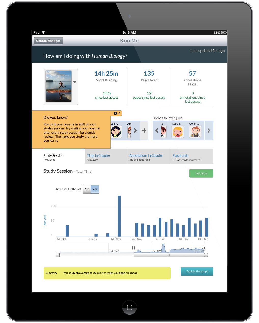 Kno Me is now available on all Kno interactive textbooks for iPad, Windows 8 and web browsers and will soon be available for Android and Windows 7.