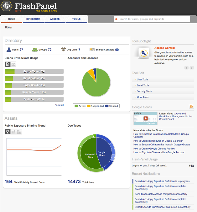 FlashPanel allows IT admins to manage domains from a single dashboard, increasing visibility into user activity, groups, organizational units, Google Docs quotas, along with CRM functionality that helps them onboard new employees, de-provision those who leave the company, back up inboxes and sync with mobile devices.