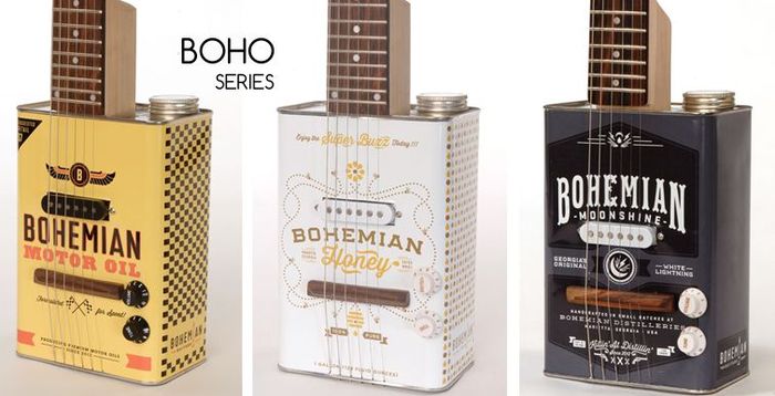The bodies are made of repurposed oil cans and they include a single coil pickup and come in three styles: honey, motor oil, and moonshine. The guitars are handmade in Georgia.