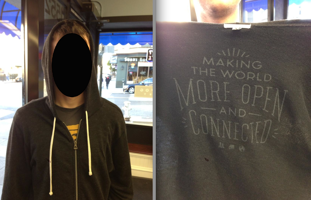 So Facebook’s new employee swag, pictured above on an engineer at the company, looks pretty awesome. It’s a hoodie, naturally, but it’s completely unbranded on the outside. On the inside, there’s a screen print of a Facebook’s mission statement: “Making the world more open and connected.”