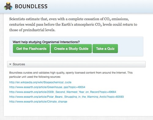 Boundless offers an entire section on its website devoted to explaining how it uses open educational resources and describes best practices for users, but users of its free textbooks will find that, at the end of each chapter, sources are cited as a list of links where students can locate the original material.