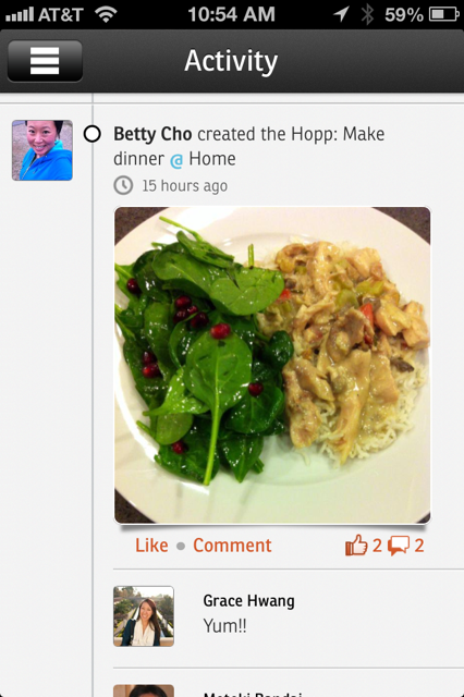 As to how it works? After entering basic stats on your gender, age, height, weight and where you live, users can begin discovering “Hopps,” or health opportunities, allowing them to track and get credit for taking small, health actions, which are associated with specific places and served based on GPS proximity. Once a user creates a “Hopp,” it is then blasted out to other users based on location and their preferences (i.e. nearby, home, office, activity, food and mood, for example), at which point they can complete and check-in to these actions, using a photograph (which are shared in a social feed).