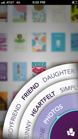 Treat, I do have to admit, offers a unique navigational element for sorting through its selection. In each category, a touch-based “wheel” pops up after you tap the button at the bottom-right of the screen (see the screenshot). From here, you turn the wheel to select who the card is for, what kind of greeting you want (e.g. “funny,” “heartfelt,” simply stated,” etc.) and whether or not you want a card that lets you include your own photos.