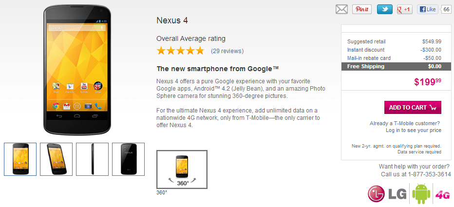 The Nexus 4 launched on the Google Play store late last year. It sold out almost immediately. T-Mobile then started selling the phone in some retail locations last week. Now, right on schedule, the Nexus 4 is available through its website as long as you’re willing to sign a contract — which is kind of a bummer.