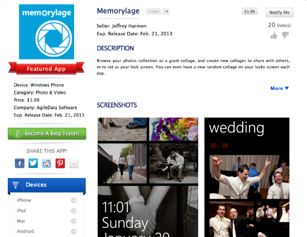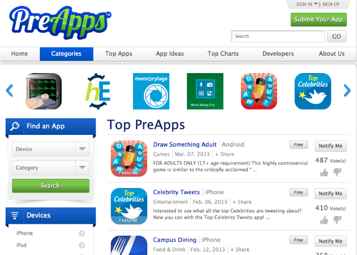 Like Google and Apple’s stores, PreApps lets developers post their apps, which are split into categories, Top Apps, and so on. Each app gets its own page with a description, pricing, expiration (or release) date, screenshots, social sharing, videos, comments and suggestions. Developers can even post polls to ask their users if they like certain tweaks or updates.