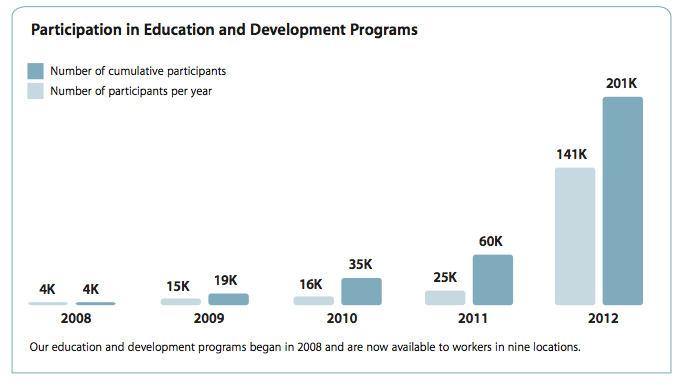 Another area of improvement for Apple was in participation in its training and education programs. There were 1.32 million workers trained on local laws, worker rights, health and safety and Apple’s own Code of Conduct during 2012, a 97 percent increase over 2011’s 670,000. Apple also provided more free educational opportunities to workers than ever before, with 201,000 cumulative participants in those programs, up 235 percent from 60,000 in 2011.