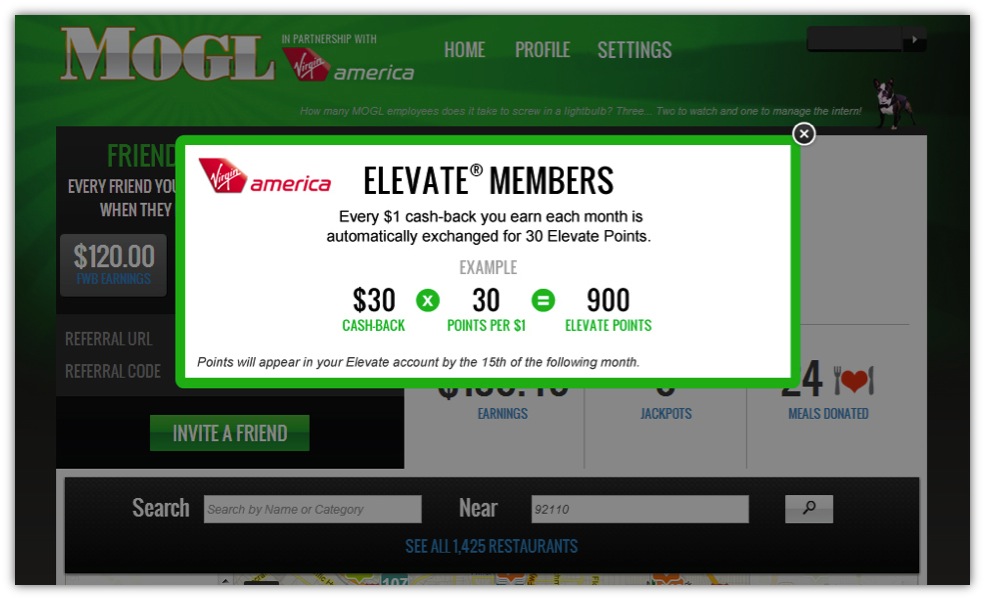 Virgin America is the hip, new airline with cool in-seat displays complete with TV shows, games, and the ability to order food. So it only makes sense that they’ve tapped Califonia-based startup MOGL to power their Elevate frequent flyer dining rewards program.