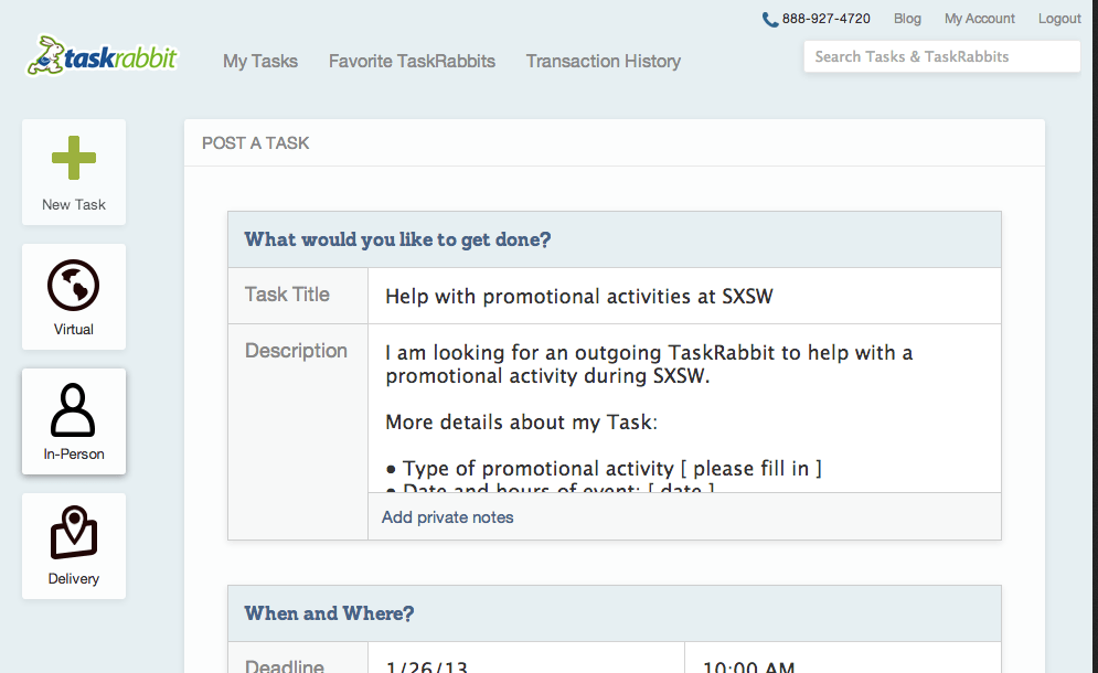To kick off the concept, TaskRabbit is launching a business-focused web portal that will be available in Austin, Texas for the South By Southwest Interactive conference coming up in early March. TaskRabbit says that last year at SXSW just after it launched its service in Austin, a number of companies used TaskRabbit to find people for tasks such as street team marketing, supply delivery, and event staff. The new dashboard is aimed at making it much easier for companies attending SXSW to use TaskRabbit for such labor.