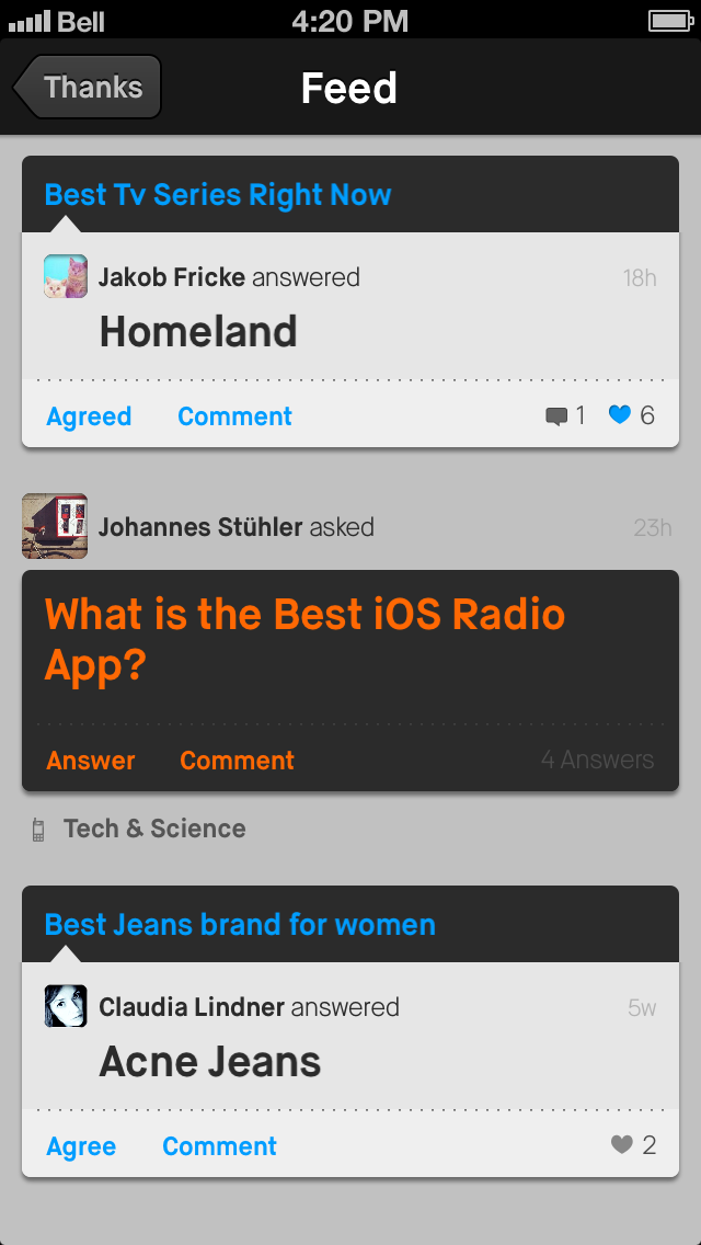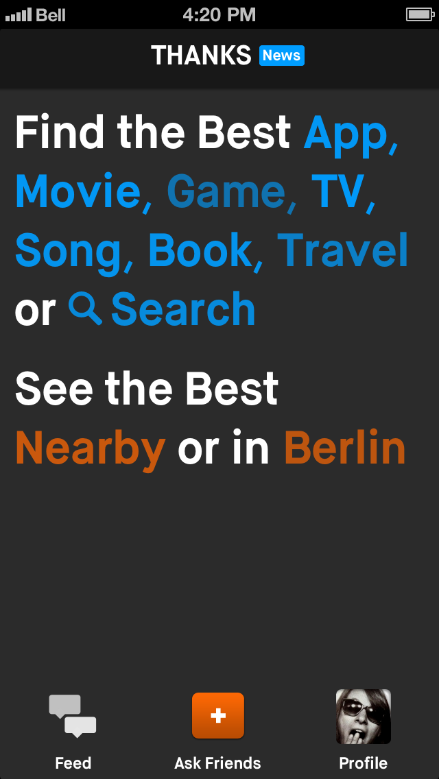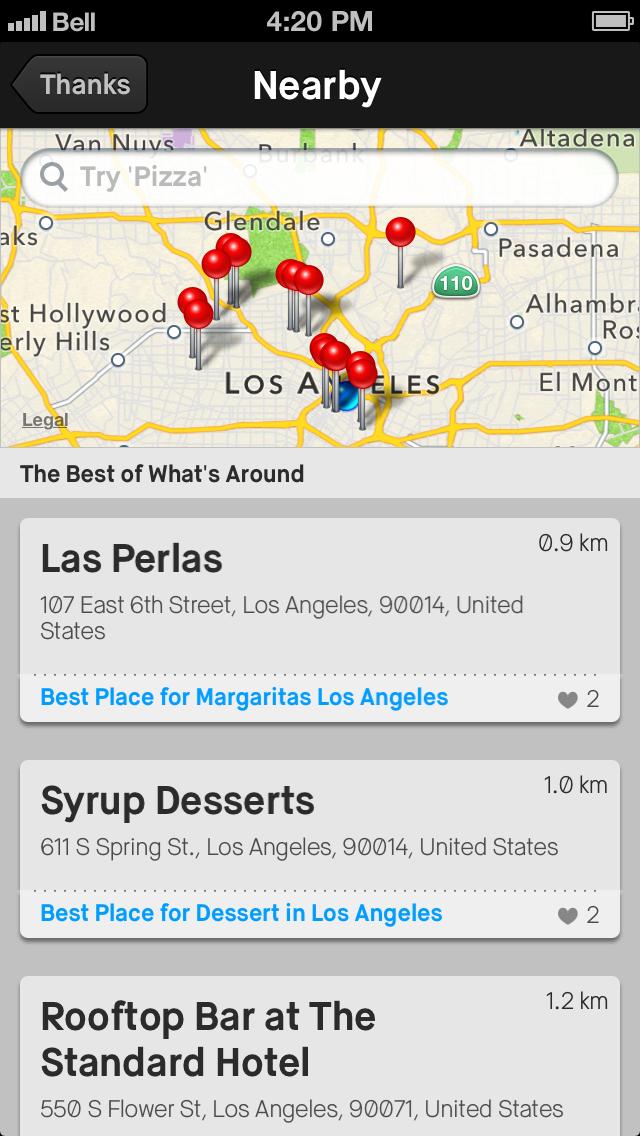 So, you need a good Hotel in Beirut? Thanks sends that question to the people who have strong opinions about Hotels in Beirut or to your Facebook friends who have actually checked in to a Hotel in Beirut. You can also ask the question in-app, share it via Twitter and pull in that data. Ideally, a few people will have already inputted “The XXX is the Best Hotel In Beirut” giving you a list of the most highly rated to the least.